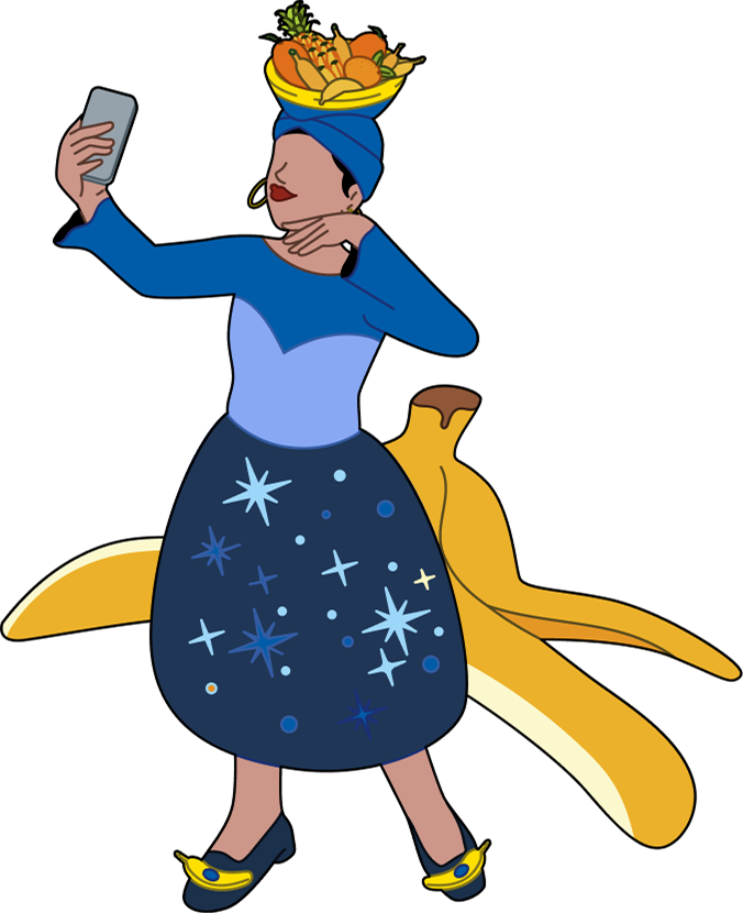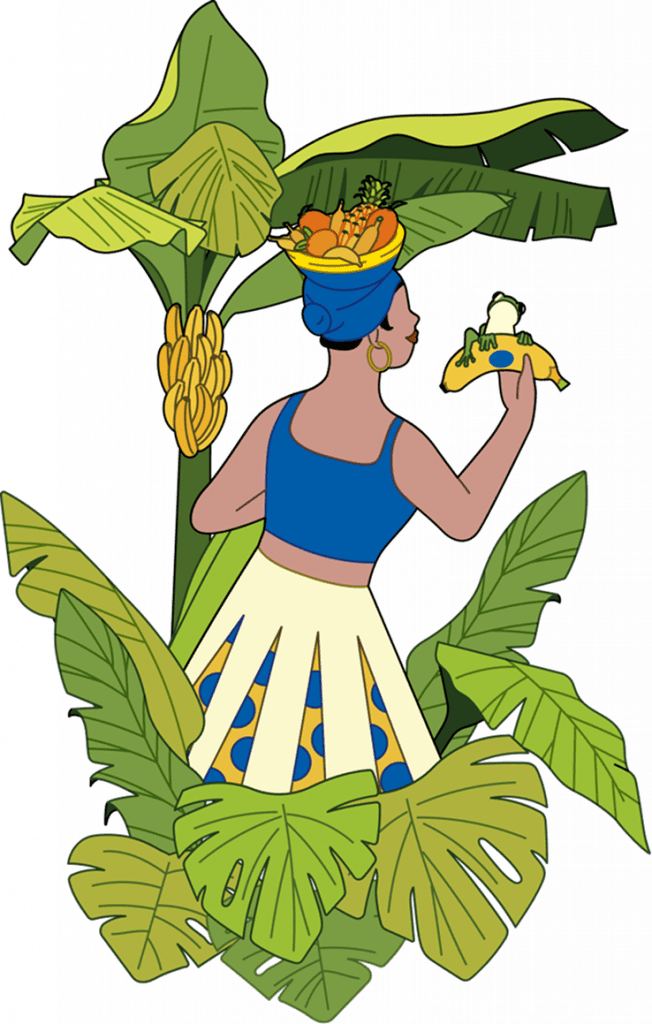 En esta pieza artística, Miss Chiquita cobra vida a través de la visión contemporánea y llena de energía pop de Jiaqi Wang. Aquí, Miss Chiquita sostiene la banana cerca del pecho, un gesto que evoca autenticidad, tradición y alegría. Su postura segura y su expresión cercana celebran la esencia tropical de Chiquita, mientras que los colores vibrantes y los paisajes luminosos rinden homenaje a la herencia costarricense de la marca.
