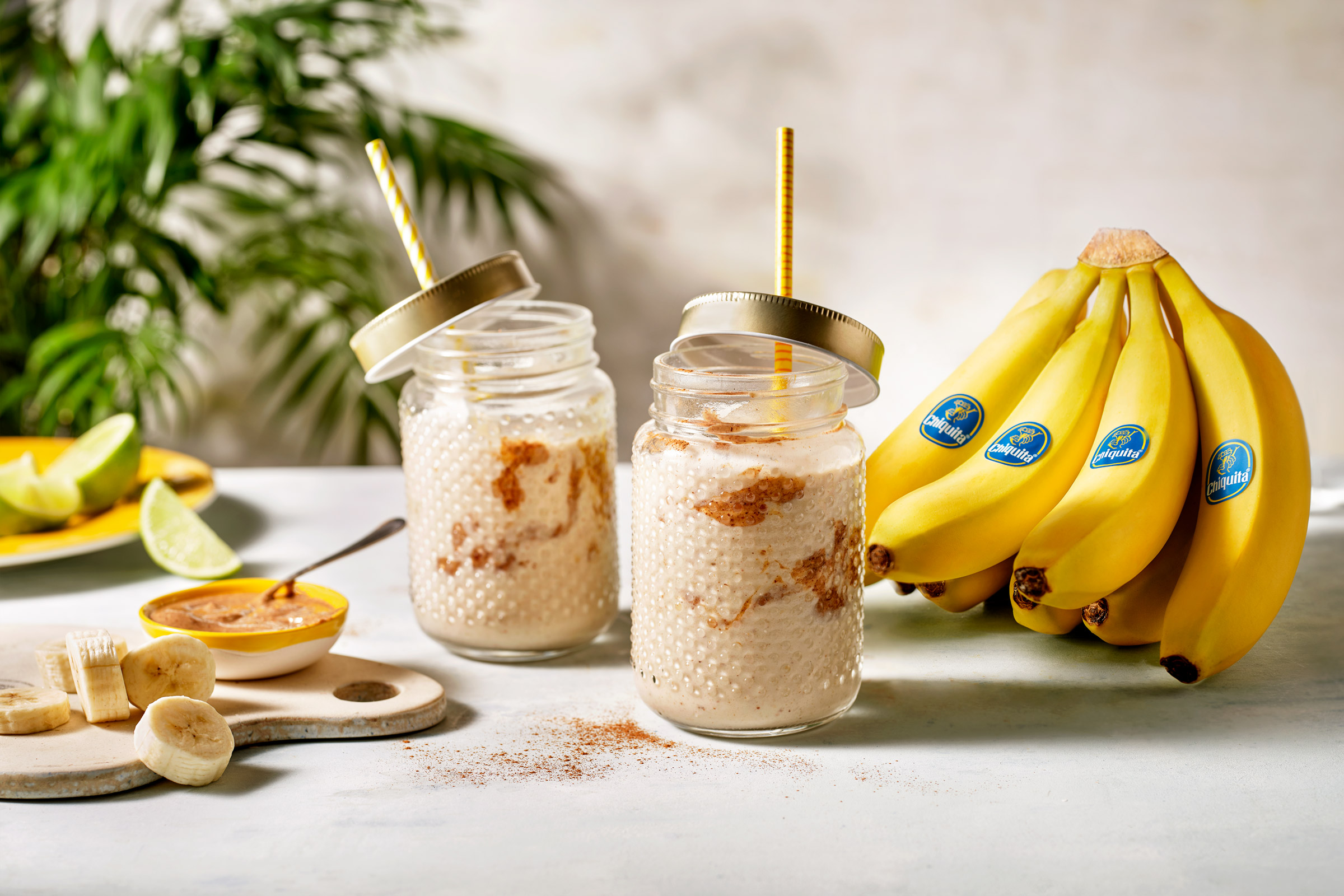 Pasa la mezcla a un vaso o jarra para batidos y adórnalo con la mantequilla de almendras y la canela.